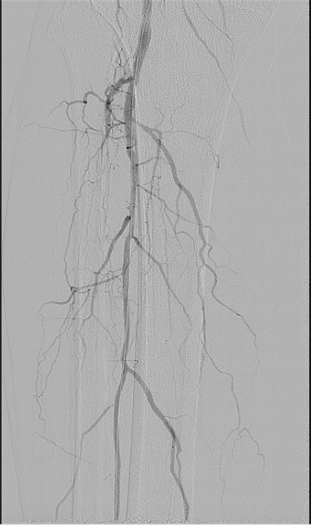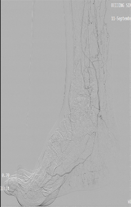 患者為69歲老人,足部冷涼,足跟部出現(xiàn)潰瘍,小腿及足部血管廣泛病變,足部潰瘍難以愈合。