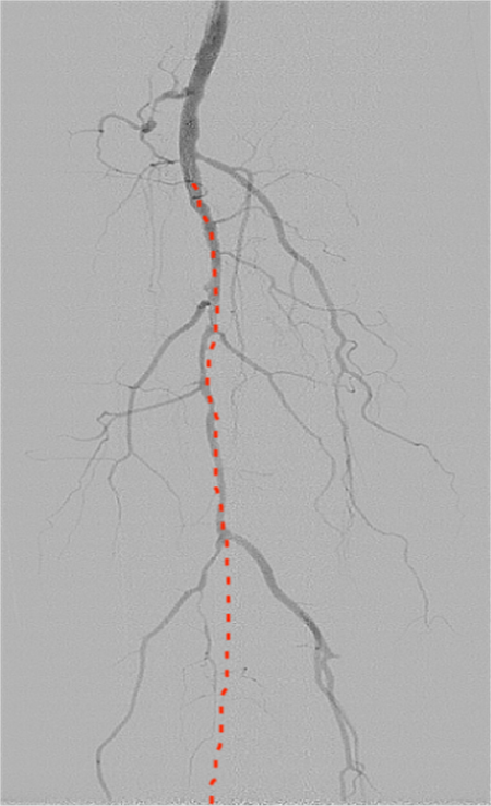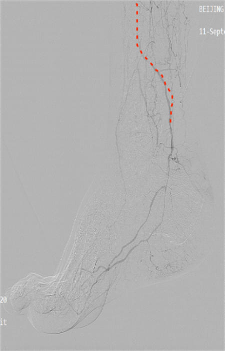 此次手術(shù)針對患者的下肢動脈粥樣硬化閉塞癥和糖尿病足周圍血管病變,預(yù)開通血管,使因血運不足引起的潰瘍愈合。(紅色虛線標(biāo)注為狹窄閉塞的血管)