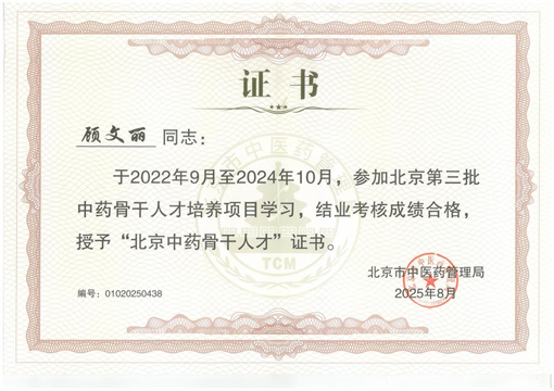 近日,北京市第三批中藥骨干人才培養(yǎng)項(xiàng)目考核合格學(xué)員名單已公布。我院藥劑科主管中藥師顧文麗歷經(jīng)三年系統(tǒng)培養(yǎng)與考核,現(xiàn)已圓滿完成全部學(xué)習(xí)任務(wù)并通過結(jié)業(yè)考核,獲評“北京市中藥骨干人才”稱號。
